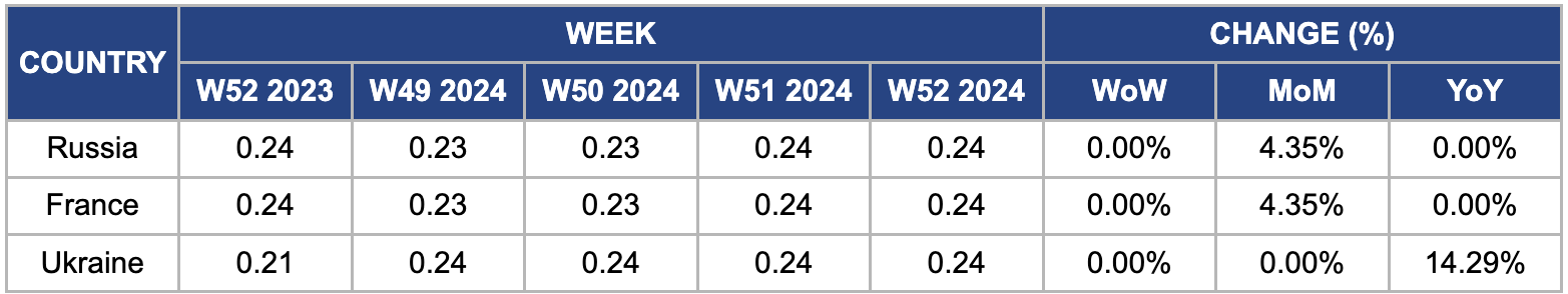 In W52, Russian wheat prices remained unchanged week-on-week (WoW) but rose by 4.35% month-on-month (MoM) to USD 0.24/kg. This price increase is due to several key factors, including higher export demand, especially from countries in the Middle East and Asia, and logistical challenges for other global wheat exporters. Russia continues to be a major supplier, with 2024 wheat exports projected to reach approximately 40 mmt, up from 38 mmt in 2023. Moreover, the tightening of global wheat supplies due to poor European harvests has reduced competition, further supporting the upward trend in Russian wheat prices.