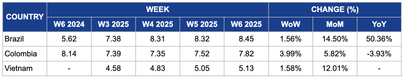In W6, Colombian coffee prices reached USD 7.82/kg, showing a 3.99% WoW and 5.82% MoM increase. The price hike is primarily driven by increasing demand amid tight supply in Colombia and other major producing countries, as well as the country's growing coffee exports. Notably, Colombia’s coffee exports grew by 17% YoY to 12.5 million bags in Jan-25, indicating robust global demand. However, compared to W6 2024, prices are down by 3.93% YoY. This decline is partly due to a 26% increase in Colombia's total coffee harvest over the past year, reaching 14.3 million 60-kg bags, which alleviated some supply concerns, leading to slightly lower prices despite the strong growth in exports.
