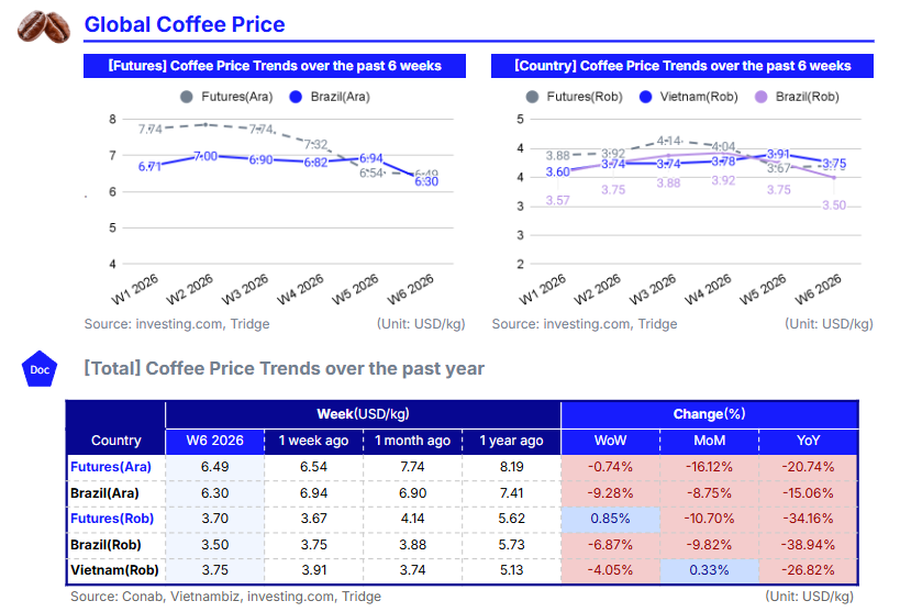 In W6 2026, global coffee prices remained under pressure for a third consecutive week as improving crop prospects and rising export flows reinforced expectations of ample supply. The international Arabica benchmark, represented by US Coffee C Futures, declined 0.74% week-on-week (WoW) to USD 6.49 per kilogram (kg), marking its lowest level in over seven months. Meanwhile, Robusta, represented by London Coffee Futures, rose 0.85% WoW to USD 3.70/kg but remains near a six-month low. The broader downward trend over the past two weeks reflects easing weather concerns in Brazil and confirmation of strong global production outlooks.