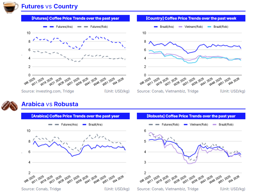 As of W6 2026, price behavior confirms that the coffee market has shifted from weather-risk premium to supply-driven repricing. With Arabica down 16.12% MoM and 20.74% YoY and Robusta falling 8.75% MoM and 15.06% YoY, the dominant driver is improving Brazilian crop conditions and expanding Vietnamese exports. Brazil’s projected 17.2% YoY production increase and Vietnam’s 38.3% YoY export surge signal comfortable near-term availability, while rising ICE inventories further weaken the scarcity narrative. Robusta faces structurally heavier pressure due to acreage expansion in Brazil and stronger Vietnamese output, whereas Arabica may stabilize sooner given relatively tighter balance dynamics.