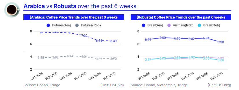 As of W6 2026, coffee futures are undergoing a broad correction driven by a rapid shift from supply-risk pricing to supply-normalization expectations. Arabica declined 16.12% MoM and 20.74% YoY from USD 8.19/kg, while Robusta fell 8.75% MoM and 15.06% YoY from USD 7.41/kg. The sharper drop in Arabica reflects the unwinding of last year’s weather premium, as improved rainfall in Brazil and projections of a 17.2% YoY increase in 2026 output significantly reduced fears of crop stress. With Arabica production forecast to rise 23.2%, futures markets have repriced to reflect improved availability, triggering fund liquidation and accelerating the three-week decline.