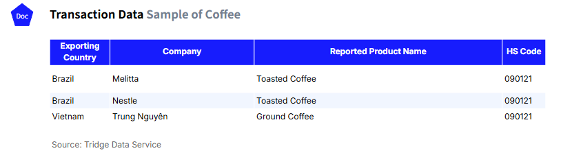 According to Tridge’s Eye transaction explorer data, commercial flows remain active in Brazil through companies such as Melitta and Nestle for toasted coffee, while Vietnam shows continued activity via Trung Nguyên in ground coffee. These transaction signals indicate steady export participation from both origins, reinforcing the case for tactical short-term sourcing rather than aggressive stock accumulation.