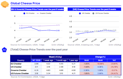 In W7 2026, EU cheddar prices fell due to subdued domestic demand and high carryover inventories, while Oceania cheddar rose, supported by seasonal supply tightening and steady exports. US cheddar declined amid ample stocks, though monthly gains reflected temporary foodservice and export support. EU cheese exports reached 1.39 mmt in 2025, highlighting cheese’s central role amid strategic adjustments, rising costs, and environmental pressures. Trade tensions with China add further complexity, as definitive anti-subsidy tariffs of 7.4% to 11.7% replaced provisional duties of 21.9 to 42.7%, restoring some competitiveness but requiring EU exporters to navigate regulatory and competitive challenges. To address weak EU prices and trade uncertainty, processors are advised to prioritize value-added cheese products, diversify export markets, and leverage seasonal demand channels in Southeast Asia, Oceania, and the Middle East to stabilize revenues and reduce exposure to commodity price volatility.