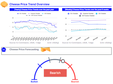 In contrast, Oceania cheddar rose to USD 4.74/kg, up 2.38% WoW and 1.28% MoM, while posting only a modest 3.27% YoY decline. The upward momentum is largely seasonal. As Southern Hemisphere milk production moves past its peak, cheese output gradually tightens, lending support to prices. Oceania’s strong export orientation also plays a stabilizing role, with steady demand from Asia and the Middle East underpinning market confidence. The relatively limited annual decline compared to Europe and the United States (US) indicates a healthier structural balance between supply and export demand.