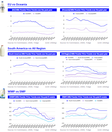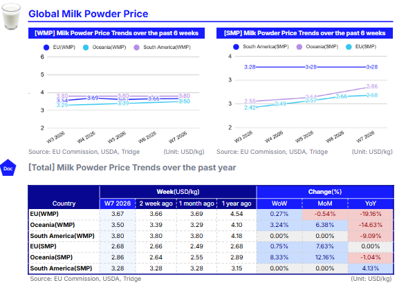South America’s SMP remained steady at USD 3.28/kg WoW, remaining at this level since W51. This resilience is driven by limited export surplus, strong domestic absorption, and relatively tight regional supply conditions.