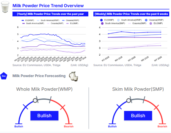 In W7, EU WMP saw a slight weekly increase but remained under pressure MoM and YoY, while SMP rose modestly, supported by steady demand from food manufacturers and exports to Southeast Asia and the Middle East. Oceania WMP and SMP strengthened due to tighter inventories and seasonal milk tapering, whereas South American WMP and SMP remained stable, reflecting balanced regional supply-demand conditions. Overally, global milk powder markets gained from early Jan-26 on short-term liquidity tightening, with EU and Oceania WMP showing moderate upward movement and GDT auction recording notable price gains for upcoming deliveries. Despite these short-term gains, EU WMP production declined, exports fell, and overall prices remained below long-term averages amid high global milk supply. Stakeholders are recommended to focus on flexible short-term procurement, diversify sourcing, stagger deliveries, and employ risk management tools to navigate volatility and optimize WMP and SMP value.