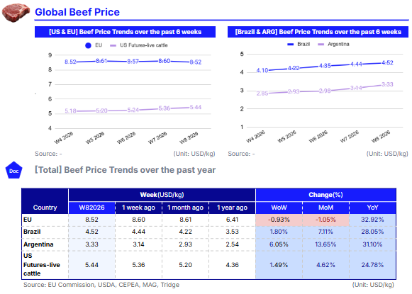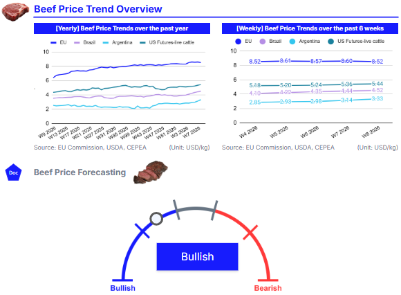 In W8, beef prices in the European Union (EU) averaged USD 8.52 per kilogram (kg), declining by 0.93% week-on-week (WoW) and 1.05% month-on-month (MoM), while remaining significantly higher by 32.92% year-on-year (YoY). The modest weekly decline likely reflects temporary supply increases or a short-term normalization in demand following strong purchasing activity earlier in the year. Despite this weekly easing, prices have remained relatively stable, fluctuating within a narrow range of approximately USD 8.52/kg to USD 8.61/kg since W4. This sustained price level highlights the underlying tightness in the market. On an annual basis, the sharp increase continues to be driven by structural factors, including ongoing herd contraction across the EU, elevated feed and energy costs in recent years, and stringent environmental regulations that limit rapid expansion in cattle production.