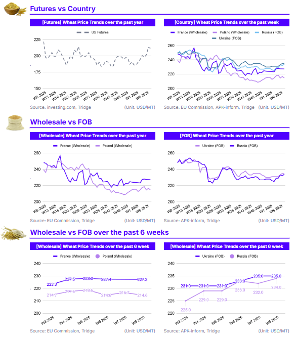 The long-term price analysis for wheat in W8 2026 reveals a market still heavily influenced by the record global harvest of 2025. In Poland, the wholesale price dropped 10.31% year-on-year (YoY) to USD 214.6/mt, while also declining 1.42% month-on-month (MoM). This downward trajectory is driven by a high global supply environment and large domestic carryover, even as Polish production for 2026 is forecast to decline to 13 mmt. Similarly, France's wholesale price stands at USD 227.3/mt, representing an 8.43% YoY decrease. While the French market is stable MoM, it faces significant structural pressure from cheaper Black Sea exports, specifically from Russia and Ukraine, which continue to challenge France’s traditional market share.
