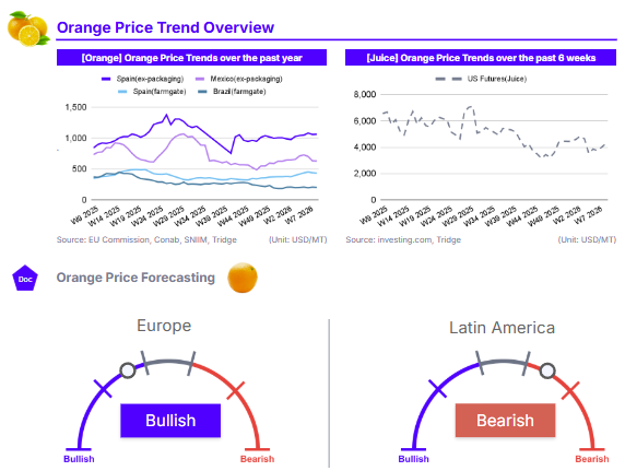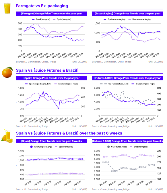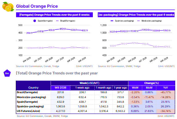 As of W9 2026, global orange prices exhibited sharp gains in US Futures contrasting with softening physical markets in Latin America and Europe. US Orange Juice Futures surged to USD 4,277.0/mt (+6.89% WoW), rebounding from early Feb-26 lows. Conversely, Brazil’s farmgate price fell to USD 201.6/mt (-2.20% WoW) as the harvest winds down, while Mexico’s ex-packaging price dipped to USD 629.0/mt (-0.54% WoW) due to weather-induced quality issues. In Spain, farmgate prices declined to USD 432.9/mt (-1.33% WoW) following supply pressure from Egypt and Morocco. Long-term analysis shows prices in Brazil and the US remain significantly lower YoY due to recovering 2025/26 production and high inventories. However, Spain maintains a strong bullish trend (+25.16% YoY) driven by a projected 9.72% seasonal production shortfall. With Brazilian orange juice inventories up 75.4% by late 2025 and European production hitting structural lows, buyers should prioritize Brazilian sourcing for juice while targeting the EU market for fresh fruit exports.