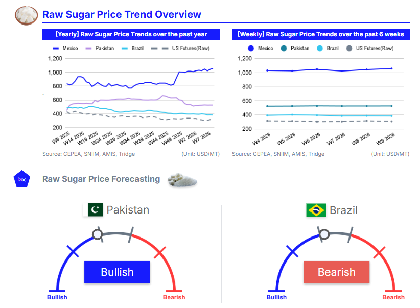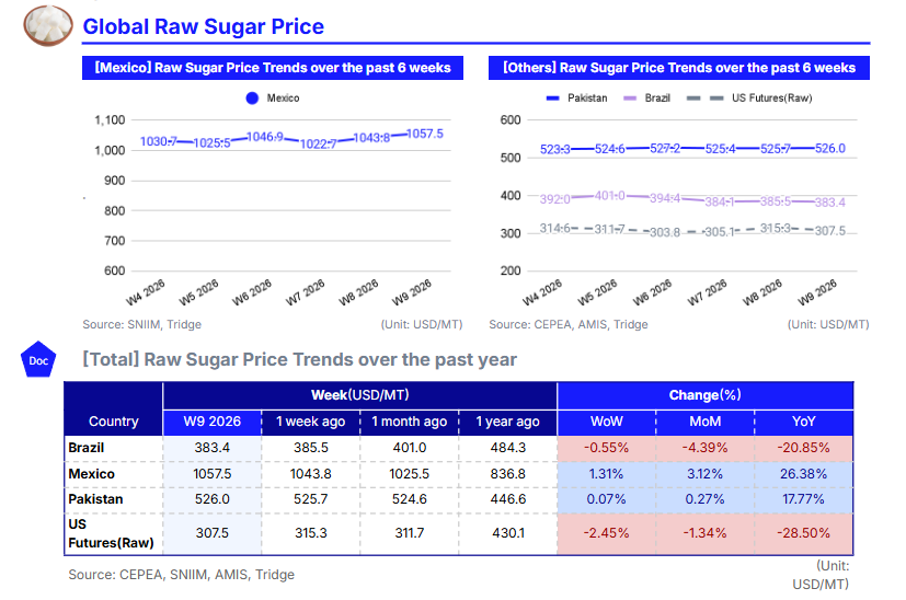 As of W9 2026, global sugar prices remain under pressure as ample supply and strong export flows continue to dominate market fundamentals. Brazil’s prices declined 0.55% WoW and 4.39% MoM to USD 383.4/mt, remaining 20.85% lower YoY as high shipment volumes and competitive pricing reinforce the country’s role as the primary global supply anchor. US raw sugar futures also weakened, reflecting oversupply and slower demand growth, while Mexico’s prices rose modestly due to protective trade policies and producer support programs. Pakistan’s prices increased slightly as imports surged, indicating localized supply tightening rather than a shift in global fundamentals.