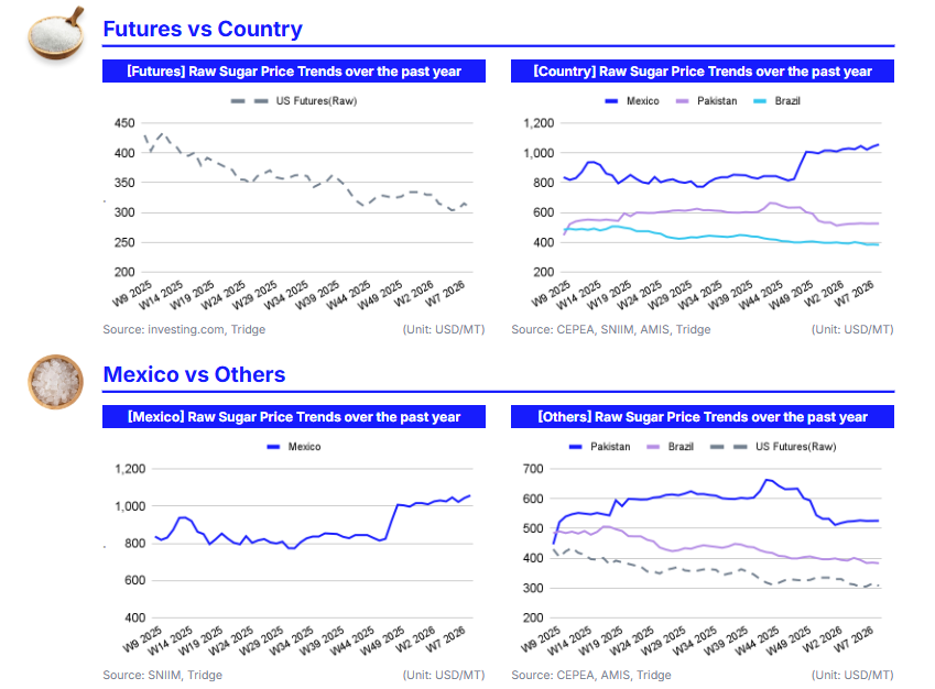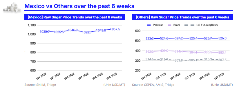 In Mexico, sugar prices increased by 1.31% WoW to USD 1,057.5/mt as government initiatives aimed at strengthening the sugarcane sector improved market sentiment. Programs led by the Ministry of Agriculture and Rural Development (SADER) are expanding access to financing at preferential interest rates of 8.5% and integrating producers into welfare support mechanisms to improve liquidity and productivity. At the same time, authorities are tightening trade regulations through high ad valorem tariffs on imported sugar to curb smuggling and protect domestic producers, factors that continue to support elevated domestic price levels.