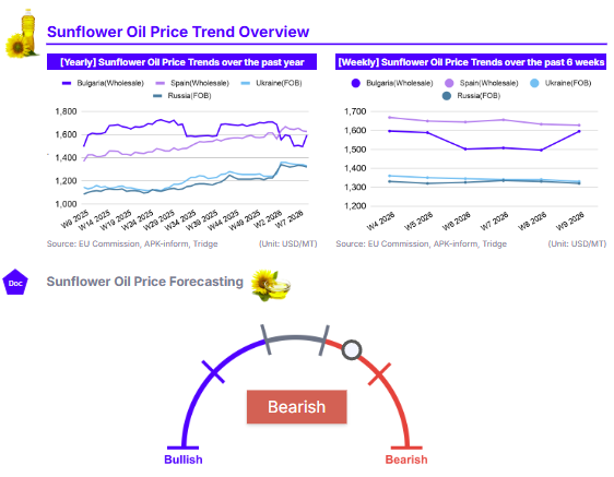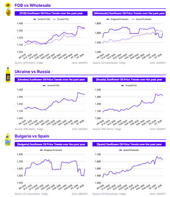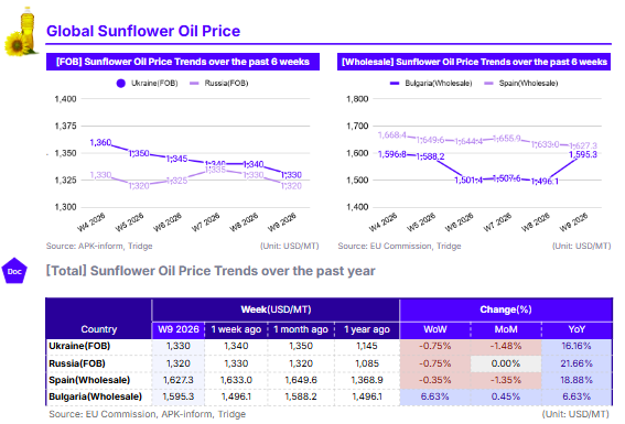 As of W9 2026, global sunflower oil prices remained high YoY due to anticipated record-low ending stocks for the 2025/26 season. Ukraine's FOB price was USD 1,330/mt (-0.75% WoW, +16.16% YoY), while Russia's FOB price hit USD 1,320/mt (-0.75% WoW, +21.66% YoY). EU wholesale markets saw Spain at USD 1,627.3/mt (-0.35% WoW, +18.88% YoY) and Bulgaria at USD 1,595.3/mt (+6.63% WoW, +6.63% YoY). The WoW price dips in Ukraine, Russia, and Spain were driven by increased supply and South American seed arrivals. However, Bulgaria’s WoW price spike was caused by pesticide residue issues in Argentine imports exceeding MRL limits. High YoY levels persist due to a 2025 production dip, with Spain 7.69% and Bulgaria 18.4% below the five-year average. Despite short-term volatility, Ukraine remains a cost-effective origin for European buyers, offering stable land-based logistics to mitigate maritime risks.