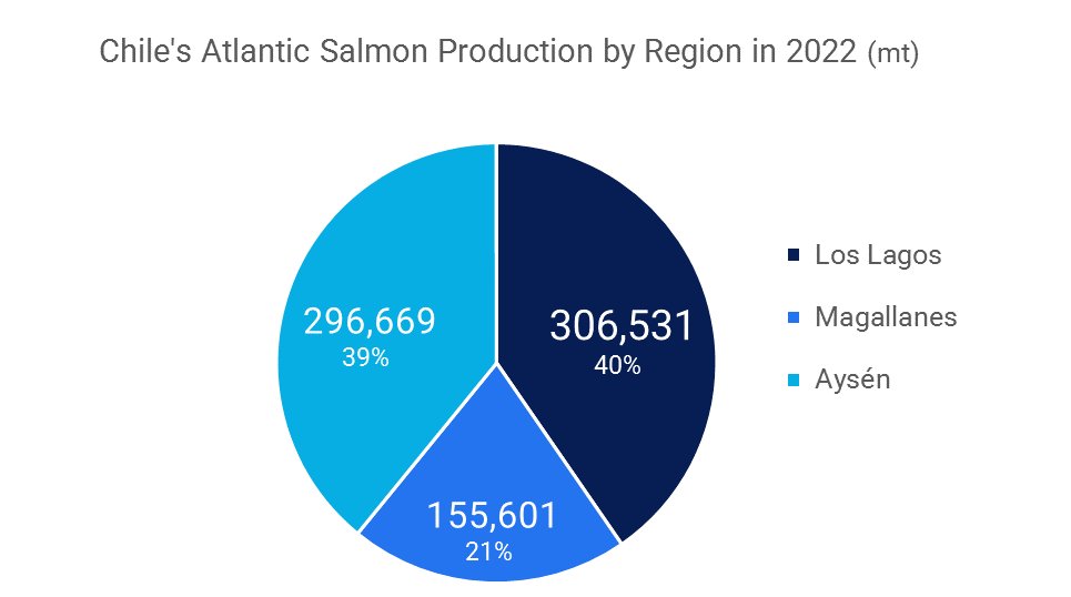 Chile's largest salmon-producing regions are Los Lagos, with 40% of Chile's total Atlantic salmon production and 74% of total Coho salmon production in 2022, and Aysén, with 39% of Chile's total Atlantic salmon production and 26% of Chile's total Coho salmon production.
