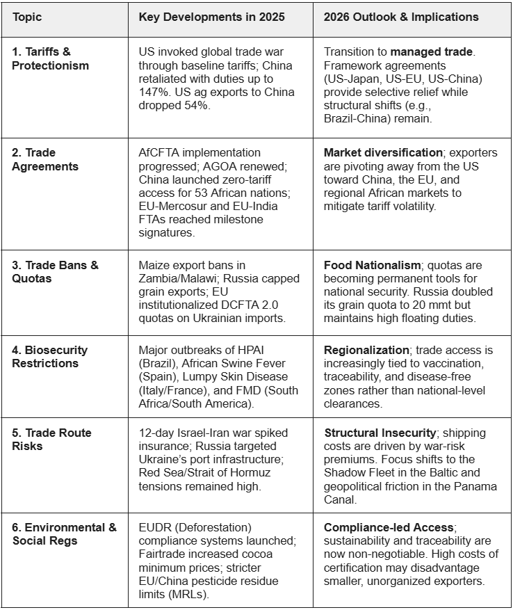 In 2025, the global agri-food sector faced unprecedented disruption as a wave of protectionism, trade disputes, and regulatory shifts reshaped markets. Aggressive United States (US) tariffs, retaliatory measures by major partners, and emerging trade agreements, from Africa Continental Free Trade Area (AfCFTA) and Africa Growth and Opportunity Act (AGOA) to European Union (EU)–Mercosur and EU–India Free Trade Agreements (FTAs)—triggered volatility across supply chains, prices, and market access. Simultaneously, export bans, quota restrictions, and biosecurity crises compounded trade uncertainty, while sustainability and environmental regulations increasingly influenced market entry and compliance costs. As 2026 unfolds, the landscape is transitioning from the reactive crisis management of 2025 to strategic, managed trade, where market diversification, non-tariff compliance, and ethical standards are becoming critical determinants of competitiveness and growth in global agricultural commerce.