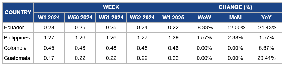 In Guatemala, banana prices held steady at USD 0.22/kg in W1, with no WoW and MoM change due to stable market conditions during the low production season in January, which balanced supply and demand. However, YoY prices increased significantly by 29.41% due to reduced production levels compared to last year, influenced by scattered showers and rainy weather early in the month. These weather conditions have slightly constrained harvesting and logistical operations, contributing to tighter supply and supporting higher YoY price levels.