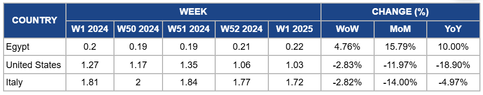 Orange prices in the US dropped by 2.83% WoW to USD 1.03/kg in W1, reflecting an 11.97% MoM drop and an 18.90% YoY decline. This is due to reduced consumer demand during the post-holiday period and increased reliance on imports, particularly from California, as Florida's orange production continues to face significant challenges. While production in Florida remains historically low due to the lingering effects of hurricanes, diseases like citrus greening, and broader issues such as climate change, the supply from other regions has helped stabilize market availability, exerting downward pressure on prices. Additionally, ongoing efforts by growers to improve yields through plant growth regulators and other scientific advancements may have slightly alleviated supply constraints, contributing to the price decline.