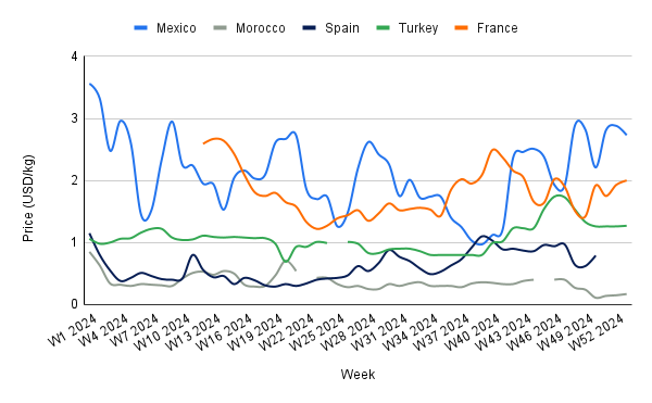 In W1, Mexico's tomato prices decreased 5.21% week-on-week (WoW) and 23.31% YoY, reaching USD 2.73/kg. This decrease is primarily attributed to increased domestic supply as favorable weather conditions in key production regions like Sinaloa and Baja California have supported higher yields. Moreover, lower export demand, particularly from the United States (US) due to seasonal adjustments and adequate domestic supplies, has reduced price pressures. The ongoing recovery of production levels following previous supply chain disruptions has further stabilized market availability, driving prices YoY lower.