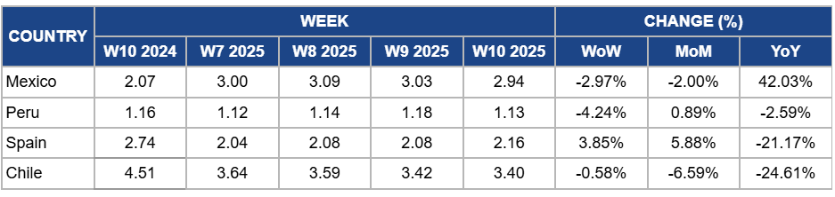 Chile's avocado prices dropped slightly by 0.58% WoW to USD 3.40/kg in W10, representing a 6.59% MoM decrease and a 24.61% YoY drop due to higher end-of-season supply, increased competition from Peru and Mexico in export markets, and subdued European demand. Additionally, the declining purchasing power in key import destinations has pressured prices, while the local market remains stable but insufficient to offset the broader downward trend.