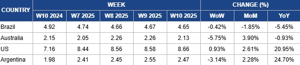 In W10, Brazil’s wholesale price for boneless rear beef declined slightly by 0.42% week-on-week (WoW) to USD 4.65 per kilogram (kg). This also represented a 1.85% month-on-month (MoM) drop and a 5.45% YoY decline. Despite this WoW decrease in USD terms, prices remained stable in local currency at BRL 27/kg for the fourth consecutive week, reflecting the impact of exchange rate fluctuations. According to Safras and Mercado, wholesale beef prices had risen slightly, with consumption during Carnival holiday being considered satisfactory. They explained that meat sales had been strong during the holiday, leading to expectations that prices would continue to rise, driven by the entry of salaries into the economy and subsequent replenishment across the supply chain.
