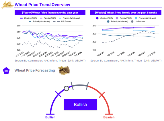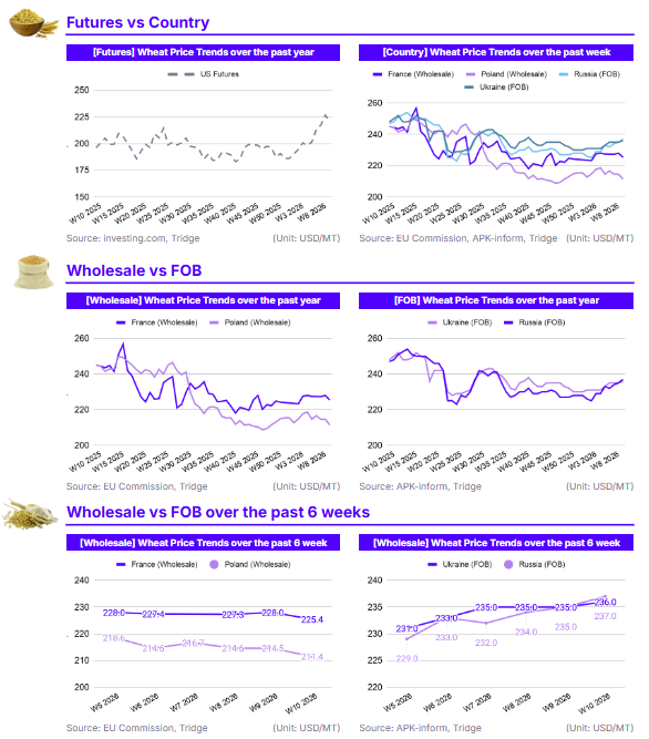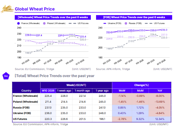 As of W10 2026, the global wheat market is increasingly shaped by escalating geopolitical tensions in the Middle East, specifically the conflict involving the US and Iran. While long-term prices remain down YoY in most regions due to the record 2025 harvest, short-term metrics show significant volatility. US Futures, despite a 2.78% WoW correction to USD 220.3/mt, have surged 12.34% YoY and 9.32% MoM. In the Black Sea, Russian and Ukrainian FOB prices rose MoM by 1.72% and 1.29% respectively, trading in a narrow band as risk premiums offset high supply. Conversely, Polish and French markets fell in USD terms due to dollar strength, despite slight gains in Euro terms. The March WASDE report lowered global ending stocks to 276.7 mmt while raising global consumption to a record 824.8 mmt. Sourcing should focus on Poland for cost-competitive EU supply and the Black Sea for price-aligned volume, provided maritime risks are managed.
