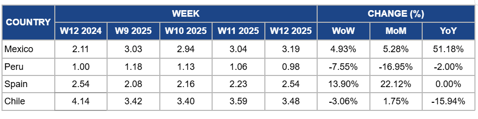 The global avocado market saw a sharp decline in export volumes alongside rising prices in W12. In the United States (US), container arrivals dropped by 26% week-on-week (WoW), with Mexico remaining the primary supplier despite a 24% WoW decrease. Uncertainty over temporary tariffs drove price increases, with larger sizes rising by up to 13%. In Europe, shipments grew by 6% WoW, led by Israel, Spain, and Peru, though Spain recorded a 44% price surge for smaller sizes. China’s avocado imports rose 47% WoW but remained 33% below last year’s levels, with Peru dominating the market despite prices standing 63% year-on-year (YoY) higher. Meanwhile, Chile reduced exports by 34%, shifting 74% of its shipments to Latin America as its presence in the US, Europe, and China continued to drop.