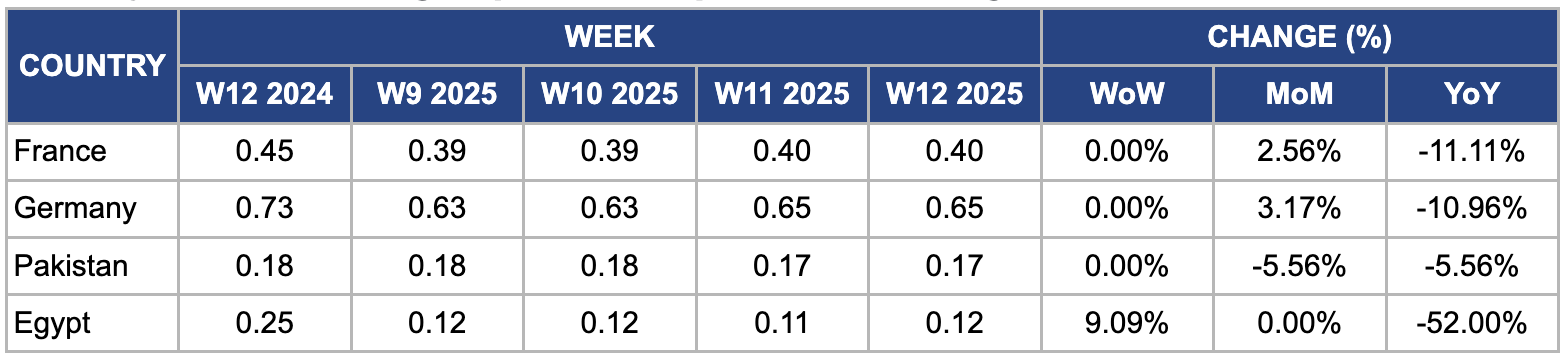 In W12, France’s potato prices remained stable week-on-week (WoW) at USD 0.40 per kilogram (kg) but rose 2.56% month-on-month (MoM) from USD 0.39/kg in W9. Lower-than-expected storage volumes from the 2024 harvest, which totaled approximately 7.9 mmt compared to 8.3 mmt in 2023, reduced market availability and drove the price increase. Persistent rainfall in key production regions, including Hauts-de-France and Normandy in Feb-25, caused logistical delays, limiting fresh supply. Meanwhile, steady demand from processors and exporters, particularly in Spain and Italy, provided additional support.