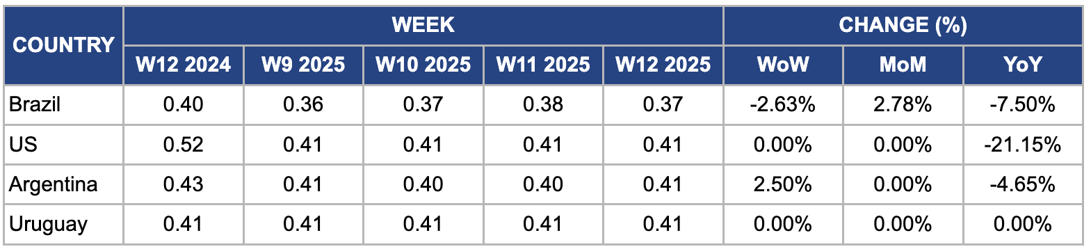 Uruguay's soybean prices remained stable at USD 0.41/kg in W12, supported by favorable market conditions and an expansion in planting area. For the 2024/25 season, Uruguay increased its soybean planted area to approximately 1.3 million ha, up from 1.2 million ha in the previous year, boosting production expectations. Moreover, strong demand from key export markets, particularly China, provided price stability despite global soybean price fluctuations. Favorable weather conditions, including adequate rainfall and moderate temperatures, further supported yield potential, ensuring steady market supply without significant price volatility.