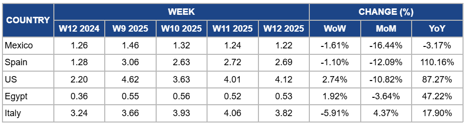 In W12, Spain's strawberry prices declined by 1.10% WoW to USD 2.69/kg, with a 12.09% MoM decrease due to improved weather conditions in Huelva, which facilitated harvesting and increased market supply. However, there is a 110.16% YoY price increase due to the significant production losses experienced in the previous year, when heavy rains and high humidity led to a 15 to 20% reduction in marketable strawberries.