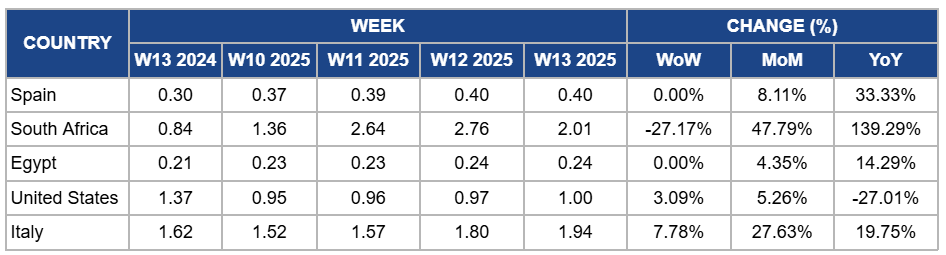 ​In the US, orange prices increased slightly by 3.09% WoW to USD 1/kg in W13, reflecting a 5.26% MoM rise. This uptick is due to significant production challenges in key citrus-producing regions, notably Florida. The 2024/25 harvest is projected at just 11.5 million boxes, a 30% YoY decline, driven by devastating hurricanes and the persistent HLB disease. These production constraints have led to reduced supply, supporting higher prices.​ However, YoY prices dropped by 27.01% due to reduced consumer demand and increased production costs. Orange juice consumption in the US has fallen by over 50% in recent decades, influenced by changing consumer preferences and elevated prices. Additionally, the emergence of new players in the processing sector, driven by a shortage of oranges in Brazil, has intensified competition, further impacting prices. These factors have contributed to the observed YoY price decrease.