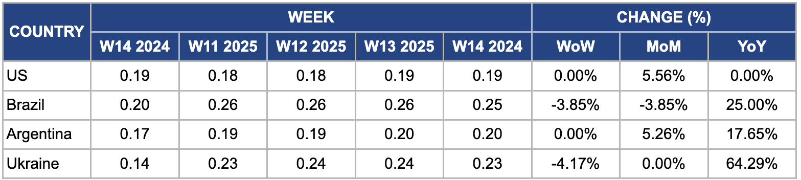 In W14, Argentine maize prices remained stable WoW but rose 5.26% MoM and 17.65% YoY to USD 0.20/kg. This price increase was due to global supply constraints caused by climate-related disruptions in major maize-producing regions, such as the US, Ukraine, and Brazil, which led to a market imbalance. As a result, Argentina experienced a surge in demand, particularly from Europe, Southeast Asia, and parts of Africa. The weaker Argentine peso also made exports more competitive, boosting international demand. Additionally, regional buyers in Latin America and the Middle East, who rely on Argentina as a key supplier, contributed to the price increase, further amplified by the global supply shortfall.