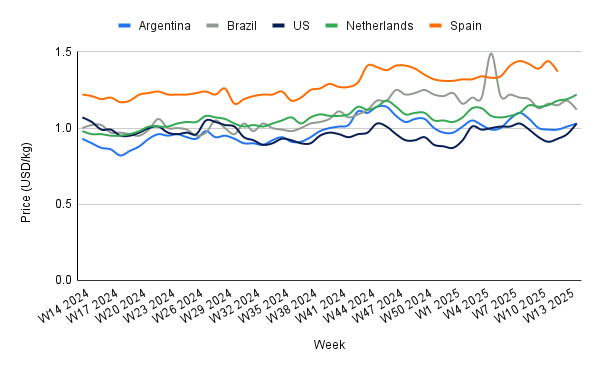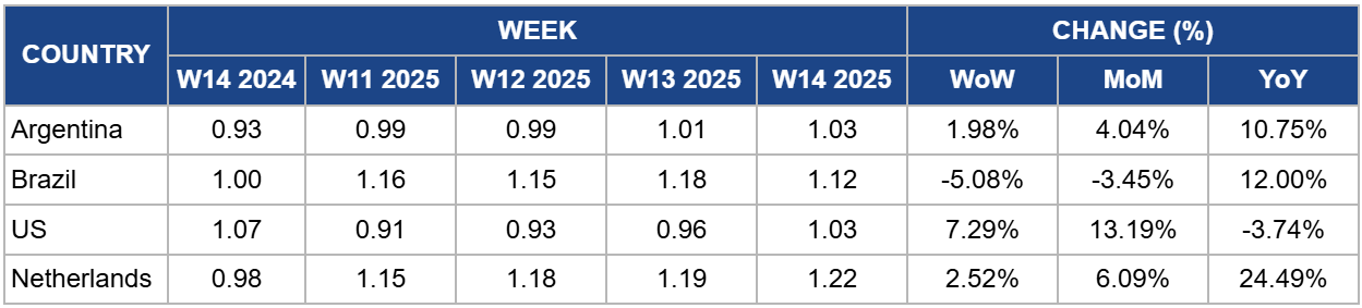 Argentina’s soybean oil prices rose to USD 1.03 per kilogram (kg) in W14, up 1.98% week-on-week (WoW) and 10.75% year-on-year (YoY), driven by tight supply conditions. Farmers are withholding soybean sales due to exchange rate uncertainty and expectations of potential tax relief, pushing sales to a 10-year low. This limited availability is supporting higher prices in the short term. If current tax and exchange rate uncertainties persist, supply constraints may keep prices elevated. However, any policy shifts—such as reduced export taxes or currency stabilization—could unlock sales, increasing supply and easing price pressure.