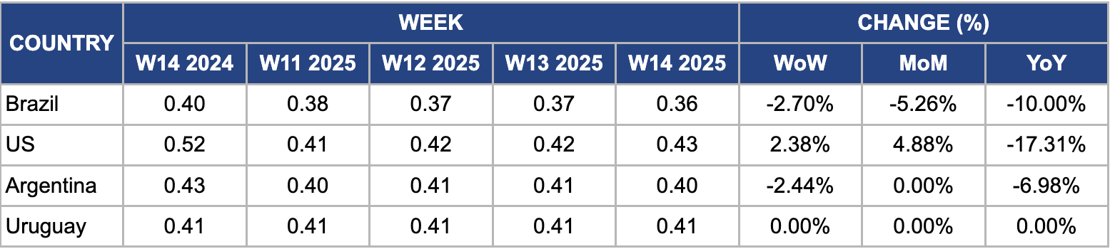 In W14, Uruguay's soybean prices remained stable at USD 0.41/kg, reflecting expectations of a strong harvest due to favorable weather conditions. Despite this, international prices have remained lower, which continues to exert pressure on margins for producers. As a result, farmers are adjusting their hedging strategies to manage financial risks more effectively. The reference price for soybeans stood at USD 364 per metric ton (mt), below the levels seen in 2023. However, this price is supported partially by higher premiums stemming from shifts in international purchasing patterns, impacting global demand and trade dynamics.