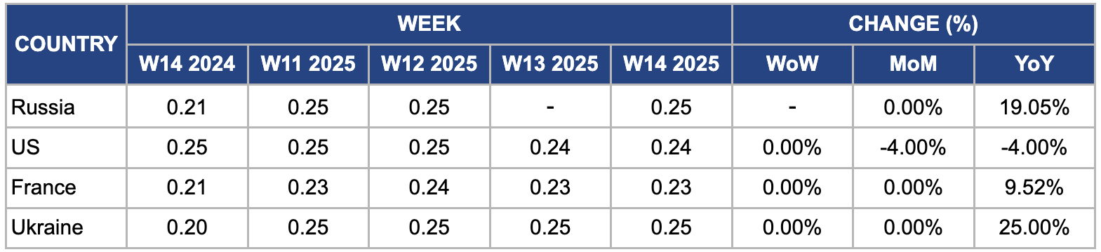 In W14, Russian free-on-board (FOB) wheat prices stood at USD 0.25 per kilogram (kg), marking a 19.05% YoY increase. Russia’s global wheat market share is forecasted to drop to 20% by the end of the 2024/25 agricultural season as lower harvests, reduced profitability for exporters, and strong yields from competitors weigh on performance. A quota limit, a strong ruble, and farmers' resistance to lowering prices will further influence export volumes. In Mar-25, Russia exported only 1.78 mmt of wheat, 2.9 times less than the previous year, according to the Russian Grain Union (RGU). Despite earlier forecasts, exports to 21 countries, including major buyers like Egypt, Bangladesh, and Sudan, also declined in volume.