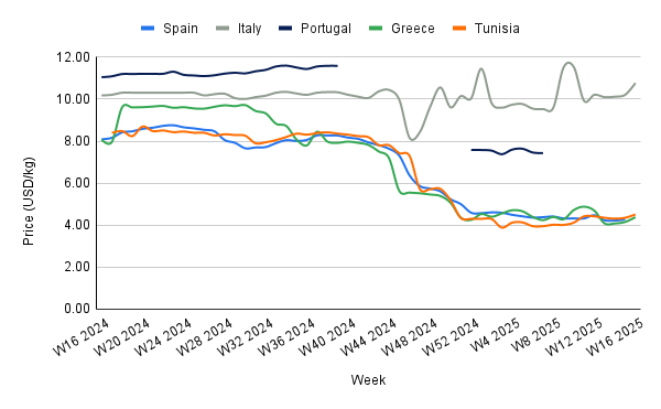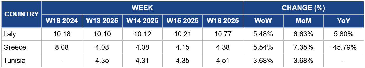 Italy's olive oil prices rose to USD 10.77 per kilogram (kg) in W16, reflecting a 5.48% increase week-on-week (WoW) and a 5.80% rise year-on-year (YoY), reinforcing the upward pricing trend driven by structural supply limitations. The sharp price differential compared to other major producers highlights ongoing challenges in the Italian sector, where climatic extremes, particularly drought and heat, have severely reduced yields, especially in key regions like Puglia and Sicily.