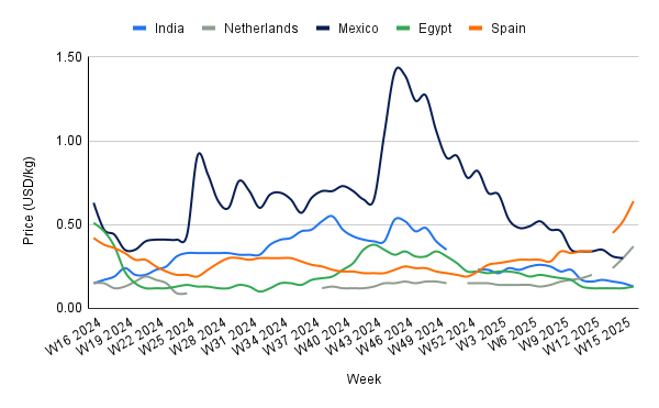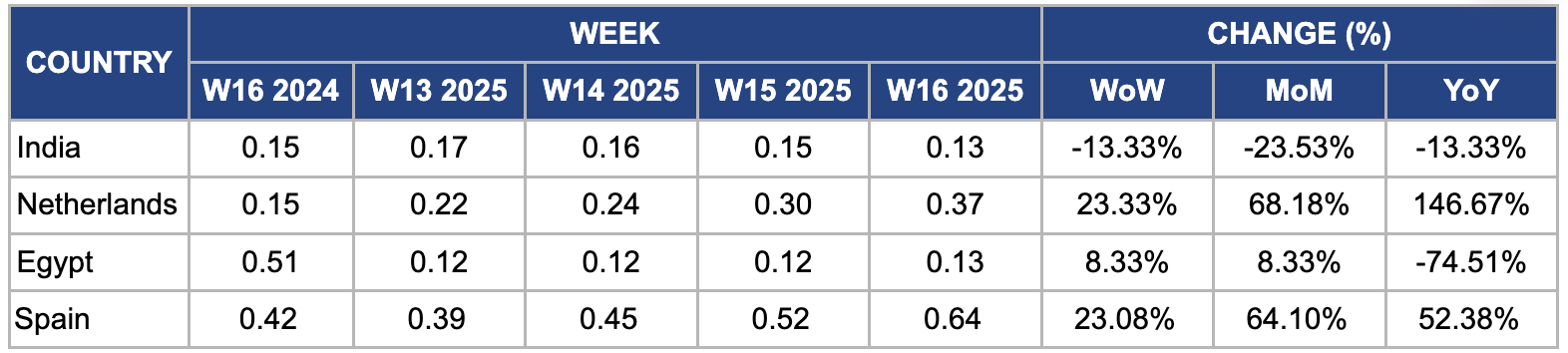 In W16, onion prices in the Netherlands surged 23.33% WoW, 68.18% MoM, and 146.67% YoY to USD 0.37/kg, fueled by tight domestic supply and robust export demand. The 2023/24 harvest was severely impacted by excessive autumn rainfall, especially in Zeeland and Flevoland, leading to delayed harvests and storage losses due to increased rot. Consequently, marketable stocks by early 2025 were nearly 25% below the five-year average. At the same time, strong export demand, particularly from West Africa (Senegal, Côte d’Ivoire) and Southeast Asia boosted shipments to over 1.3 mmt in Q1-2025, up 5% YoY. Moreover, an 18% YoY increase in energy and storage costs also added to upward pricing pressure.