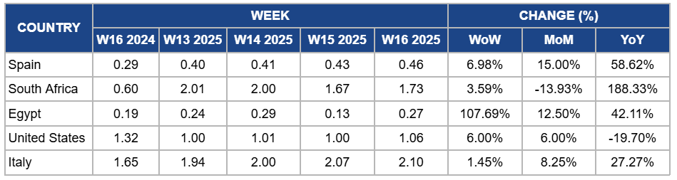 Italy's orange prices increased by 1.45% WoW to USD 2.10/kg in W16, reflecting an 8.25% MoM rise and a 27.27% YoY surge. This upward trend is due to heightened production costs, including high prices for fertilizers, pesticides, and energy, which have significantly impacted the agricultural industry. Additionally, Italy's annual inflation rate reached an 18-month high of 1.9% in Mar-25, further contributing to the overall increase in consumer prices, including those of fresh produce. Despite these cost pressures, the demand for Italian oranges has remained robust, driven by their reputation for quality and freshness. However, the MoM price increase is also influenced by seasonal factors, as the peak harvest period for oranges in Italy typically concludes by March, leading to tighter supplies in April. This seasonal decline in availability and sustained demand has exerted upward pressure on prices. The YoY surge is further amplified by the previous year's lower prices, which were affected by favorable weather conditions and higher yields, making the current prices appear significantly elevated in comparison.​