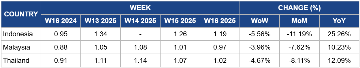 In W16, Indonesia's palm oil prices declined to USD 1.19 per kilogram (kg), a 5.56% week-on-week (WoW) drop, though still 25.26% higher YoY. The recent price pressure reflects expectations of increased supply, with the United States Department of Agriculture (USDA) projecting 2025/26 production to rise to 47 mmt, up 1.5 mmt from the previous season, driven by favorable weather and improved yields.