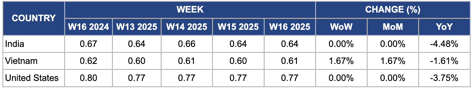 In W16, India's wholesale rice prices remained stable WoW and month-on-month (MoM). However, prices fell by 4.48% YoY, dropping from USD 0.67/kg in W16 2024 to USD 0.64/kg. This decline is due to a significant increase in domestic supply due to a record-breaking 2024/25 harvest, which is estimated at 135.5 to 138 mmt, up from 130 mmt in the previous year. Moreover, the Indian government's decision to lift the export ban on white rice and reduce the export duty on parboiled rice has improved market liquidity, exerting downward pressure on prices. While domestic demand remains steady, the surge in supply and easing export restrictions have contributed to the price correction.
