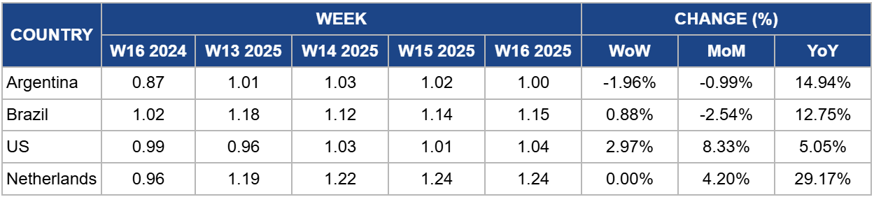 Argentina's soybean oil prices fell to USD 1 per kilogram (kg) in W16, down 1.96% week-on-week (WoW), reflecting weaker global demand and robust supply expectations. Despite a projected 3.5% decline in soybean processing to 41.5 million metric tons (mmt) for the 2024/25 season, overall processing remains 14% above the five-year average, supporting relatively high oil output.