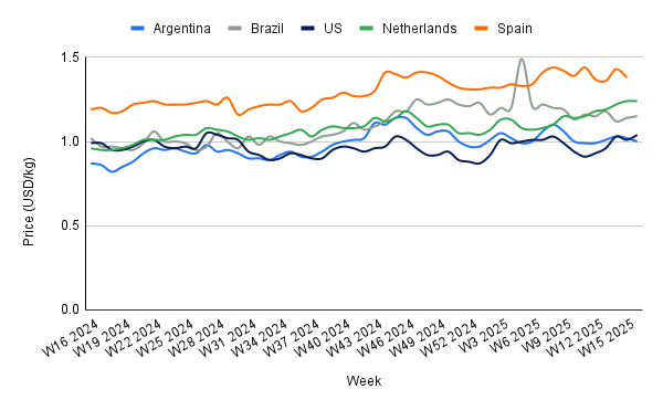 In W16, soybean oil prices in the Netherlands held steady at USD 1.24/kg for the second consecutive week, reflecting a 4.20% month-on-month (MoM) and 29.17% YoY increase. This sustained strength highlights firm domestic and regional demand amid tightening global supplies and rising geopolitical tensions. As a major European Union (EU) hub for soybean imports, particularly from the US, the Netherlands faces increased risk of supply disruption following the EU's approval of retaliatory tariffs on US agricultural goods, including soybeans. Should these duties be implemented, US soybean flows to the Dutch market may decline, potentially tightening availability for crushing operations and supporting further price firmness.