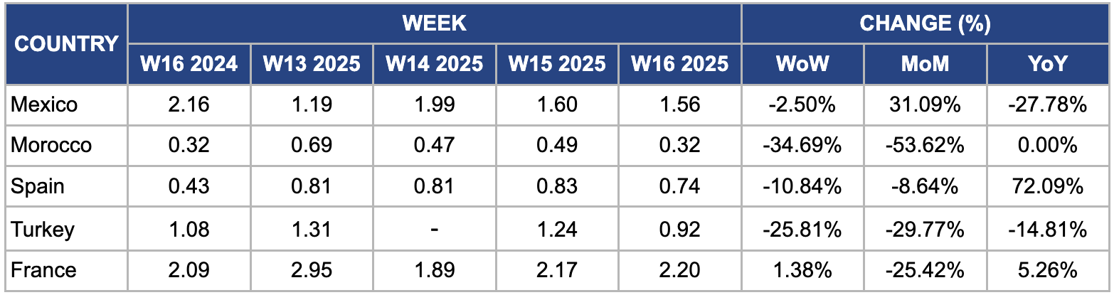 In W16, Morocco's tomato prices declined significantly by 34.69% WoW and 53.62% month-on-month (MoM), reaching USD 0.32/kg. This sharp drop is due to the Moroccan government's implementation of export quotas, which reduced daily tomato exports to Europe by 90% for round and grape varieties. These measures were enacted to prioritize domestic supply and stabilize local market prices. Consequently, the influx of tomatoes into the domestic market increased, leading to a substantial price drop. The timing of these interventions was crucial, as the demand for food typically spiked during Ramadan, further necessitating such actions to ensure local availability and prevent price inflation.
