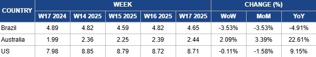 In W17, Brazil’s wholesale boneless rear beef price fell by 3.53% week-on-week (WoW) to USD 4.65 per kilogram (kg), reflecting a 3.53% month-on-month (MoM) drop and a 4.91% YoY decline. The price reduction is largely attributed to weaker demand following the Easter holidays. According to Safras and Mercado, the physical beef cattle market showed minimal trading activity, with many processing industries stepping back from purchases. Safras and Mercado expect further price declines, citing improved slaughter scale conditions and anticipating a notable increase in the supply of finished cattle from mid-May-25, aligning with the peak of the beef harvest season. While wholesale prices remain relatively firm, the overall market is expected to see limited upward adjustments throughout the rest of the month due to the sluggish pace of meat sales. However, the first half of May-25 may experience a temporary boost in demand, driven by Mother’s Day celebrations.