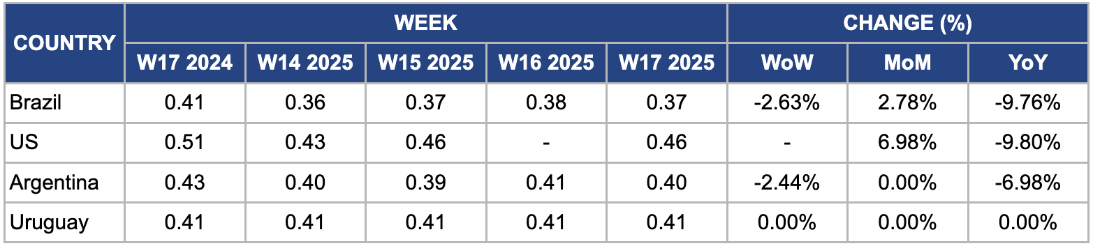 In W17, Uruguay's soybean prices remained steady WoW at USD 0.41/kg, reflecting a balance between recovering domestic production and subdued global market conditions. Following a severe drought in 2023 that slashed output to 700 thousand mt, Uruguay's 2024/25 soybean harvest rebounded significantly, with production estimated at 3.1 mmt. This recovery was supported by favorable weather conditions and improved yields, bringing production levels closer to the five-year average. Despite the production rebound, international soybean prices have been under pressure due to record harvests across South America, particularly in Brazil, leading to an oversupply internationally.