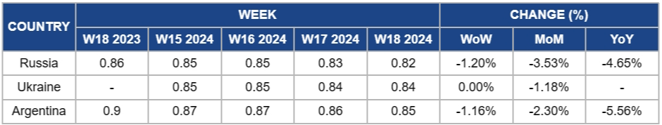 In W18, Ukraine's sunflower oil prices remained unchanged for the second week at USD 0.84/kg. Furthermore, Ukrainian crushes reported considering switching to processing rapeseed in the new harvest due to possible sunflower shortages, which are currently at their lowest levels in the past three seasons.