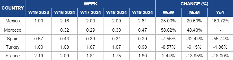 Yearly Change in Tomato Pricing Important Exporters (W19 2023 to W19 2024)