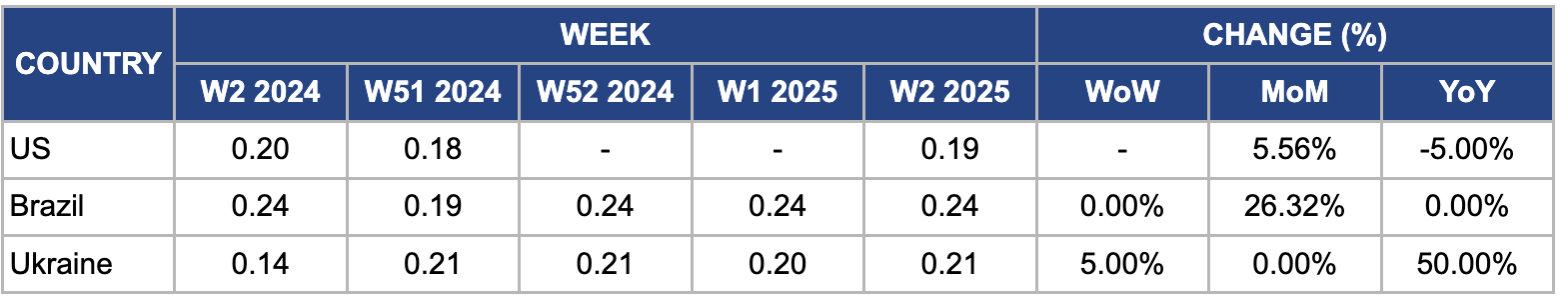 In W2, wholesale maize prices in the US rose by 5.56% month-on-month (MoM), reaching USD 0.19 per kilogram (kg). The United States Department of Agriculture (USDA) has revised its corn production forecasts for the 2024/25 season, projecting a decrease in yields to result in a corn harvest of 377.63 mmt, down by 7 mmt from the Dec-24 estimate. The lower production forecasts have also led to a projected drop in corn stocks in the US by 5.03 mmt by the end of the period.