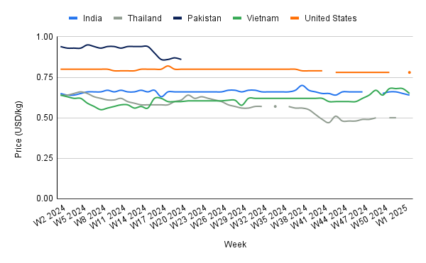 * Vietnam, Pakistan, and India are wholesale pricing, while the US and China are FOB pricing * Varieties: Vietnam and Thailand (5% broken rice), Pakistan (basmati), the US (milled white long), and India (overall average) * Blank spaces on the graph signify data unavailability stemming from factors like missing data, supply unavailability, or seasonality