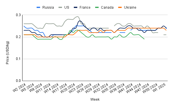 In W2, Ukrainian wheat prices declined 4.17% WoW and MoM to USD 0.23/kg. The wheat harvest forecast in Ukraine remained unchanged at 22.9 mmt, but the export forecast was reduced to 16 mmt. Despite the drop, prices rose by 9.52% YoY, primarily due to reduced wheat production in major exporting countries such as Russia and the European Union (EU), which has led to a more competitive market for Ukrainian wheat. For example, Russia's 2024 wheat harvest decreased by 10 mmt compared to the previous year, and the EU also experienced a smaller harvest, resulting in less wheat available for export. Furthermore, Ukraine's wheat exports have been robust, with significant sales to countries like Egypt, which purchased 120 thousand mt of Ukrainian wheat in 2024.
