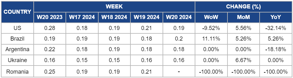 The wholesale price of Argentinian maize remained unchanged WoW at USD 0.18/kg, despite the USDA lowering corn production estimates for Argentina to 53 mmt from the previous estimate of 55 mmt in Apr-24.