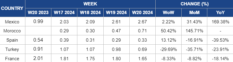In Spain, tomato prices increased by 13.12% WoW to USD 0.33/kg. However, prices decreased by 16.91% MoM compared to USD 0.29/kg in Apr-24, and decreased by 39.53% YoY. This price decrease is due to the persistent drought, which has significantly reduced tomato production, leading to concerns about future water availability and the need to import tomatoes with potentially lower quality standards.